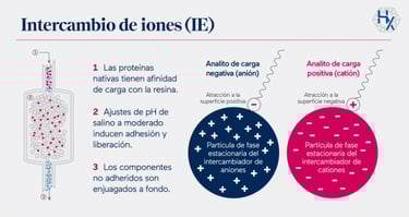 El suero crudo pasa por columnas que retienen solo las proteínas deseadas (alfa-lactoalbúmina, beta-lactoglobulina, albumina, inmunoglobulinas).